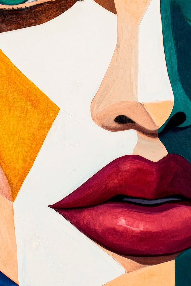A fascinating interplay of colours and shapes comes together in this artistic portrait, which delights with its vibrant shades of green and bold lips. The contrasting surfaces immediately draw the eye and add a modern flair to any room. This work of art is ideal for the living room, where it stimulates conversation and encourages creative inspiration.