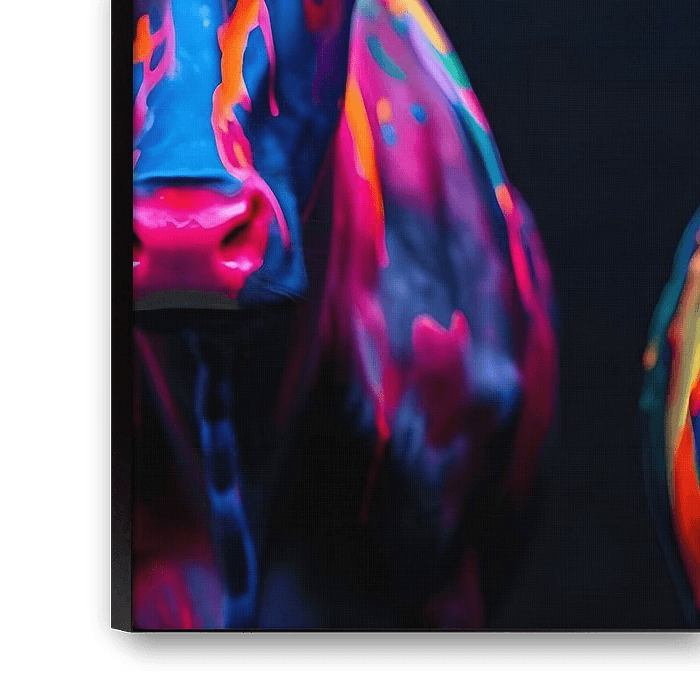 This vibrant painting captures the cheerfulness of the countryside with a playful depiction of colourful cows. The vibrant colours splash off the canvas and create an upbeat atmosphere. The cows, each with their own unique colour pattern, look curiously and playfully into the lens.