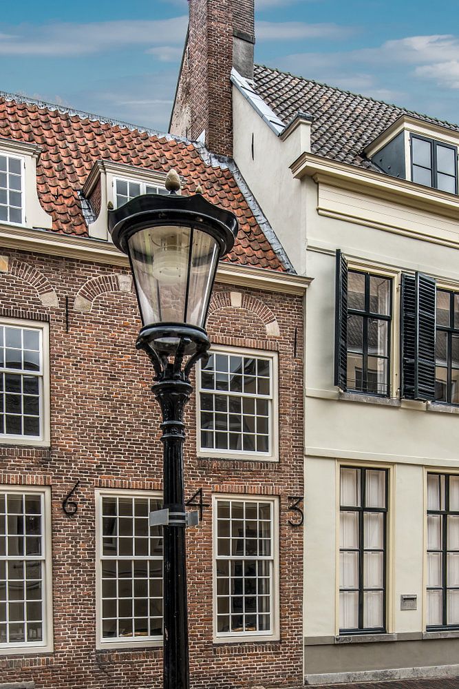 Pleintje met historische huizen en een lantaarnpaal in Utrecht. by Harrie Muis