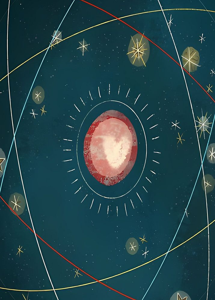 The image depicts a stylized representation of Pluto, the dwarf planet, against a dark blue background. The planet is depicted as a red circle with a white heart at its center, surrounded by a series of white, yellow, and red orbital paths. Scattered across the background are numerous white and yellow stars, adding to the celestial theme.