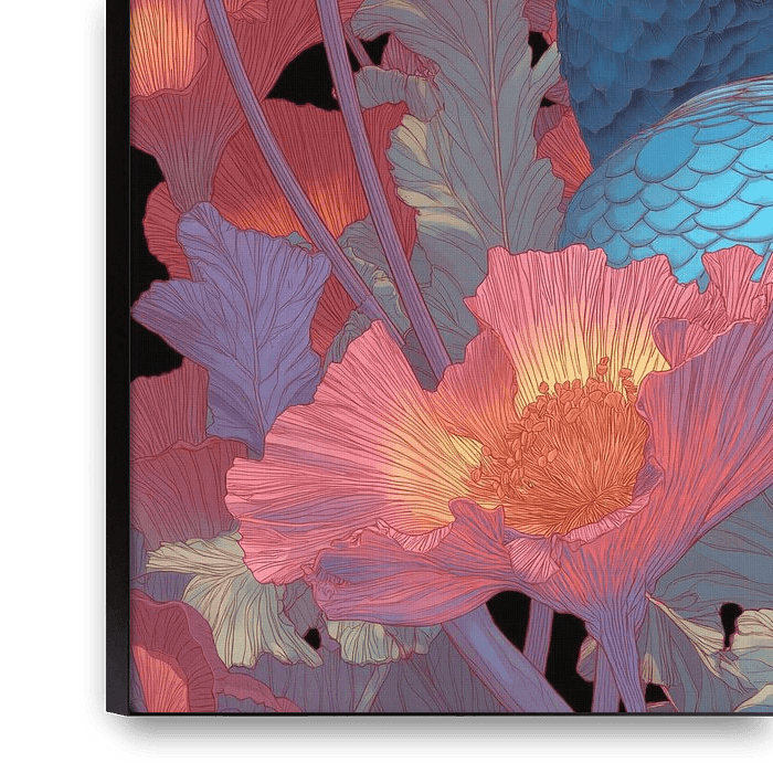 A majestic peacock with bright blue feathers is gracefully enthroned between opulent poppy blossoms in warm red tones. The stylised, almost surreal depiction combines elegant natural motifs with strong contrasts and artistic details - an eye-catcher for any wall.