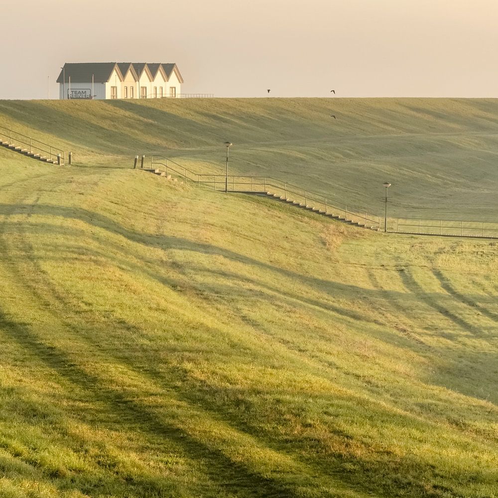 On a misty morning with the sun rising just above the crown of the trees, I saw 4 white buildings on the dike near Lelystad.