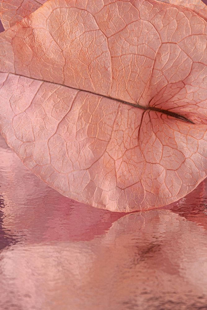 "Pop of Colour: Old pink leaves of a Bougainvillea with pink - purple background" is a macro photo of a set of leaves (three leaves held together by a stalk) of the Bougainvillea. As these leaves have fallen off the plant and dried in the sun, the colour has softened and the veins can be seen beautifully in the leaf. In the old pink / light pink leaves, you can see different shades of pink and also some orange pink. (If you zoom in on the work, you can see this.
