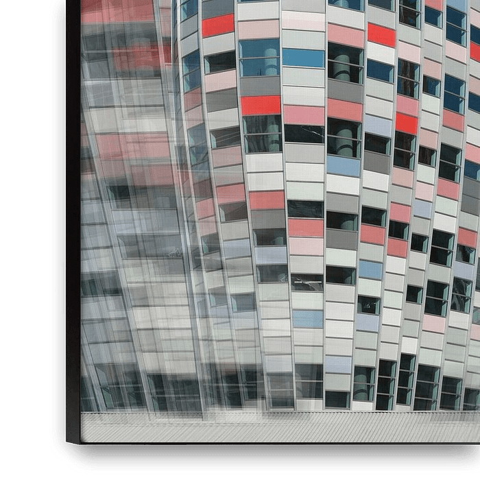 The image of this modern building with its colourful facade has been manipulated to resemble a pop-up building emerging from a larger structure.