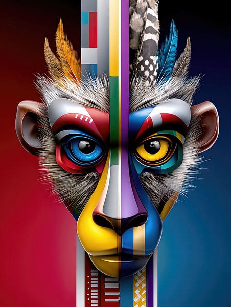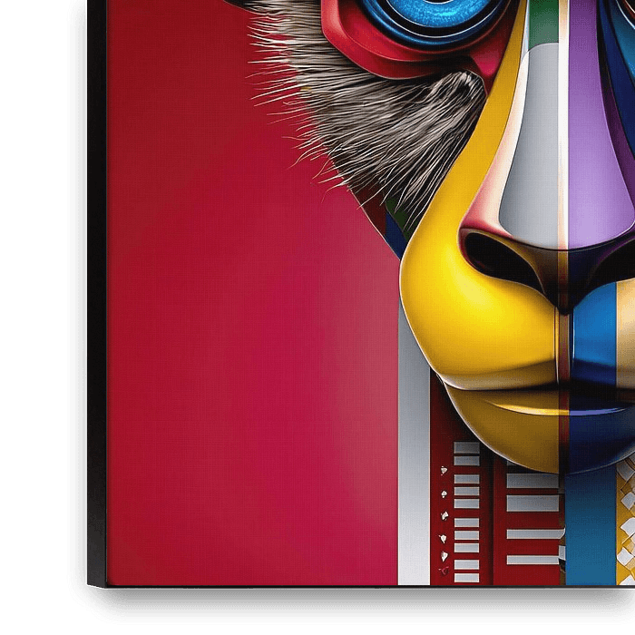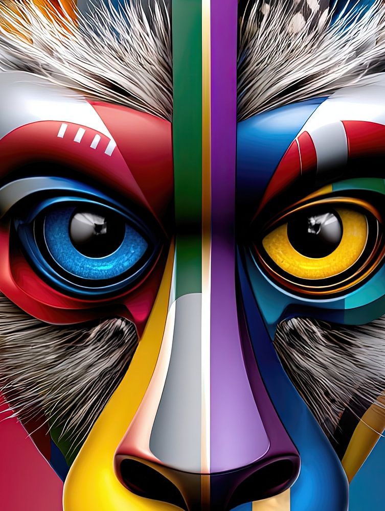 This pop art portrait shows an animal in a state of radical division. The face is split exactly along the central axis, each half follows its own world of colour, its own logic, its own emotional tone. Warm reds and organic structures dominate on the left, cool blues and controlled surfaces on the right. This division is not a graphic…