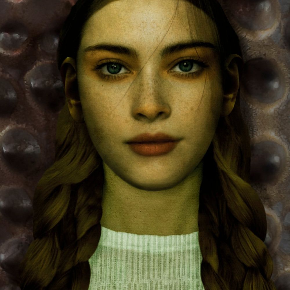 Popart Beauty, on her head rests not a classical crown, but a purple spiked globe: rough, shiny, almost otherworldly. A helmet of remembrance and protection. The spines catch the light tingling in lilac and lavender.
