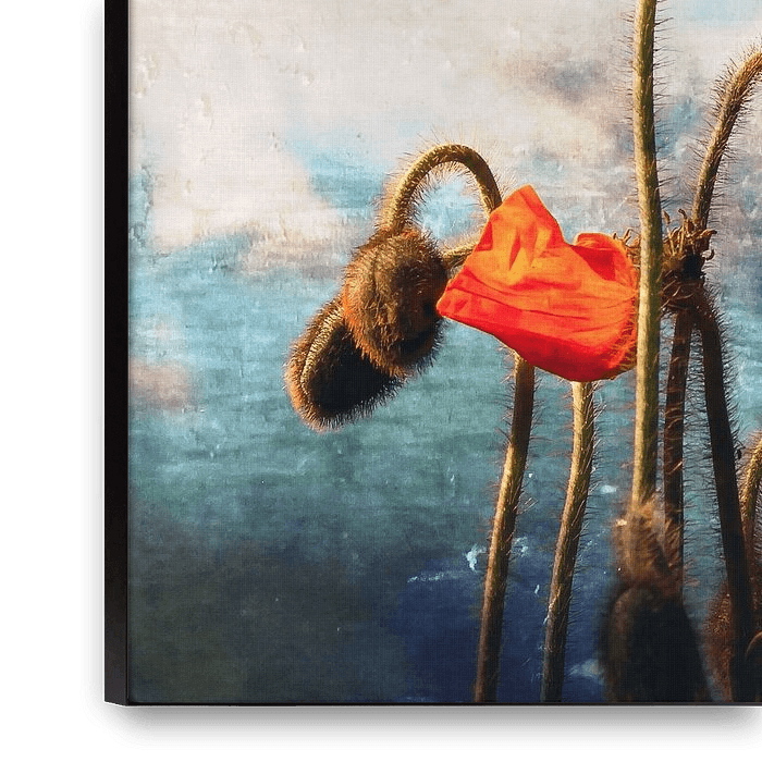 A vibrant red poppy flower stands tall against a background featuring soft blue hues and a dreamy, cloudy abstracted sky. The stems and buds add depth to the scene.