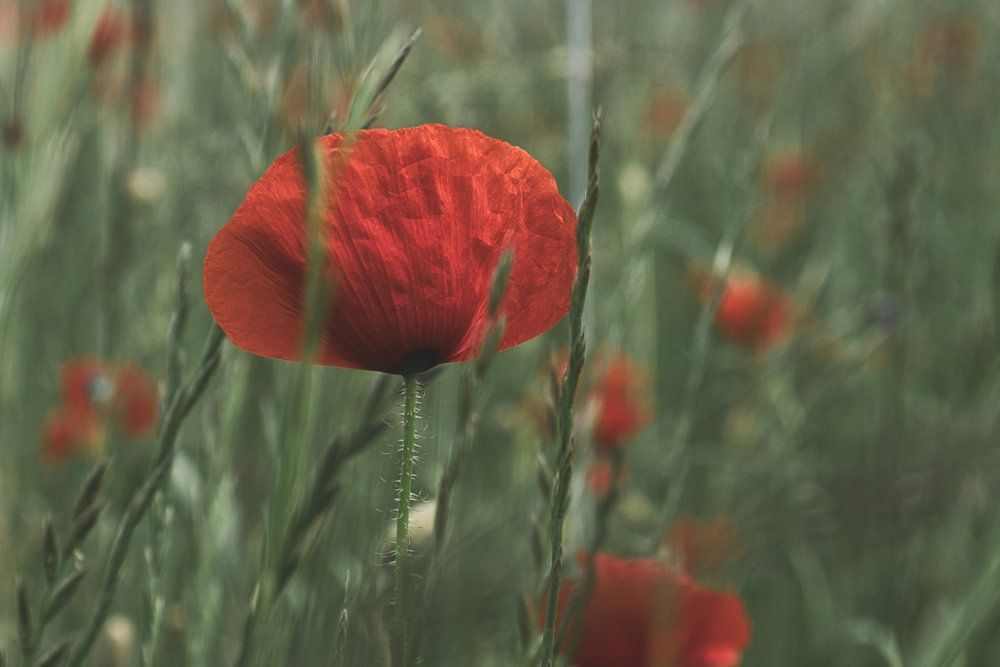 Poppy flower with red petals. Field of poppies. Red flowers with green leaves. Early summer flowers.