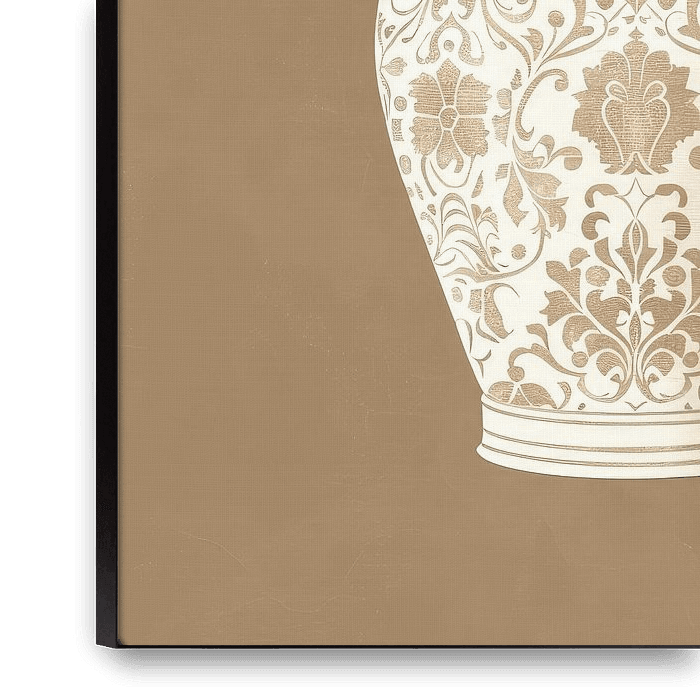 The soothing, trendy artwork involves an ornate, beige and white porcelain pot with a sophisticated pattern.