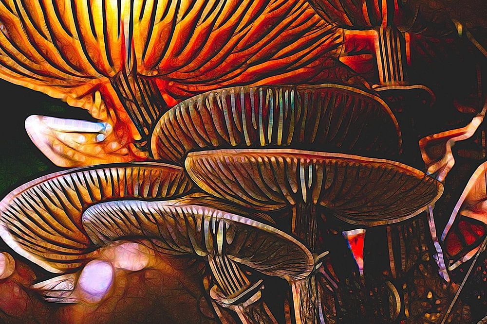 Digital processing of a group of porcelain mushrooms standing on an old beech tree in the sunlight, with the light falling through the hat.