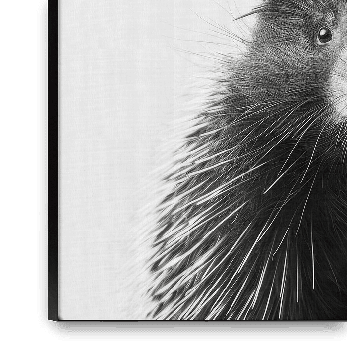 This fascinating black and white portrait of a porcupine emphasises the impressive structure of its quills and the fine details of its face. The high-contrast photography emphasises the elegance and natural defence mechanisms of this unique animal. A perfect work of art for lovers of animal portraits and nature photography.
