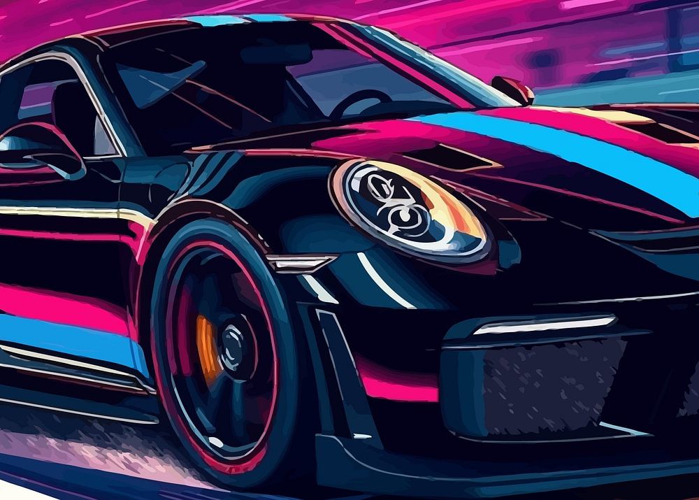The Porsche 911 GT3 RS illustration captures the car speeding through a neon-lit cyberpunk cityscape. With its iconic aerodynamic design, the car blurs past glowing skyscrapers and futuristic streets, leaving a trail of light. The vibrant neon colors contrast with the sleek, aggressive lines of the GT3 RS, emphasizing its performance and precision in a high-tech, electrifying environment.