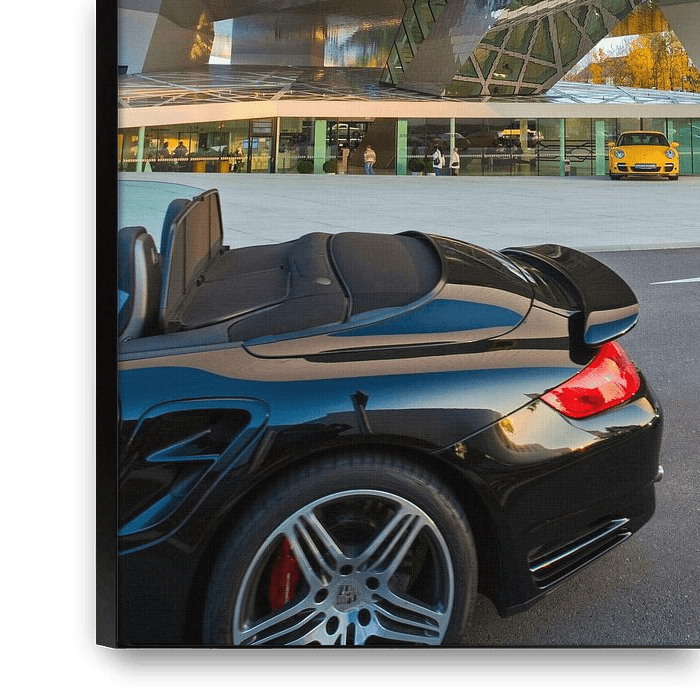 Porsche 911 Cabriolet in front of the Porsche Museum, architect Delugan Meissl, in Stuttgart-Zuffenhausen, Stuttgart, Germany