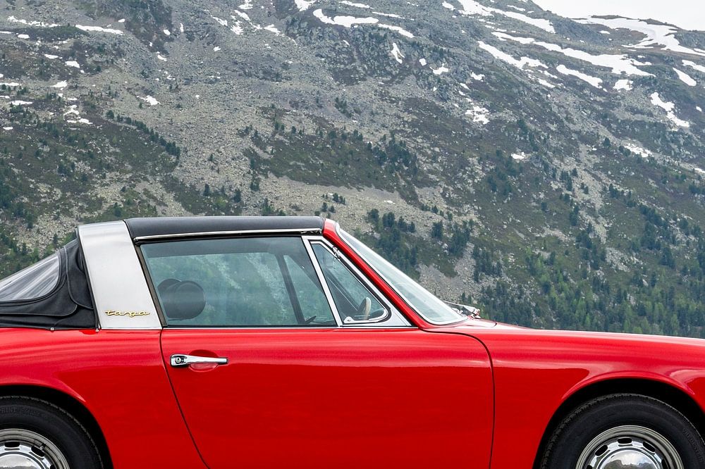 Porsche 912 Targa classic sports car parked alongside and alpine road high up in the Tyroler Alps in Austria. The Porsche 912 Targa is a classic sports car produced by Porsche AG from 1965 to 1969 as a more affordable version of the 911. The Targa variant of the 912 was introduced in 1966 and was known for its distinctive open-top design with a rollbar and removable top and rear section of the roof.