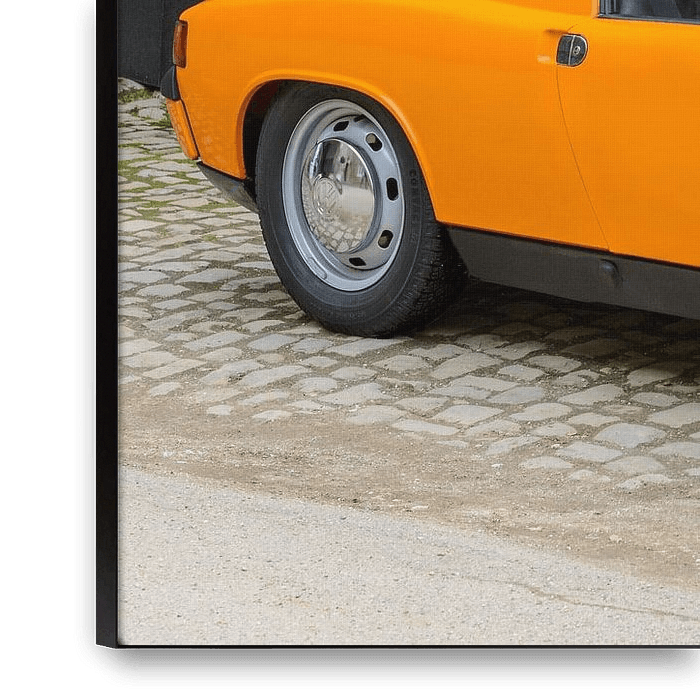 Porsche 914 classic sports car in bright orange parked on a square. The Porsche 914 or VW-Porsche 914 is a mid-engined, targa-topped two-seater roadster designed sports car manufactured by Volkswagen and Porsche from 1969 until 1976.