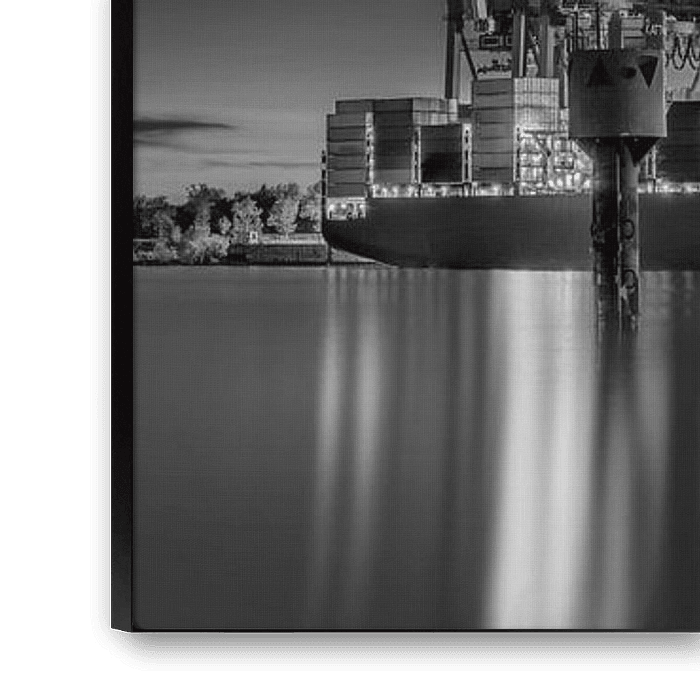 * Container Terminal * Black & White Photography. Harbour cityscape of the city of Hamburg in Northern Germany. The picture shows a container terminal in the harbour of Hamburg with a ship / freighter and big cranes. Panorama in black and white 90310191ays