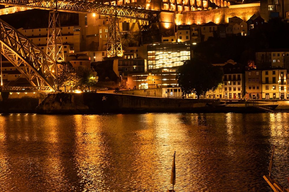 Night shot of Porto, with the bridge "Ponte Dom Luis I" over the Douro River. The lights of the city are reflected in the river and make this scene a magical photograph for Porto and Portugal fans.