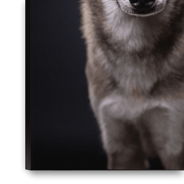 Portrait photo of a Tamaskan Wolfhound against a dark navy blue / black background. With the look of a wolf, this dog gives a beautiful look to the photo.
