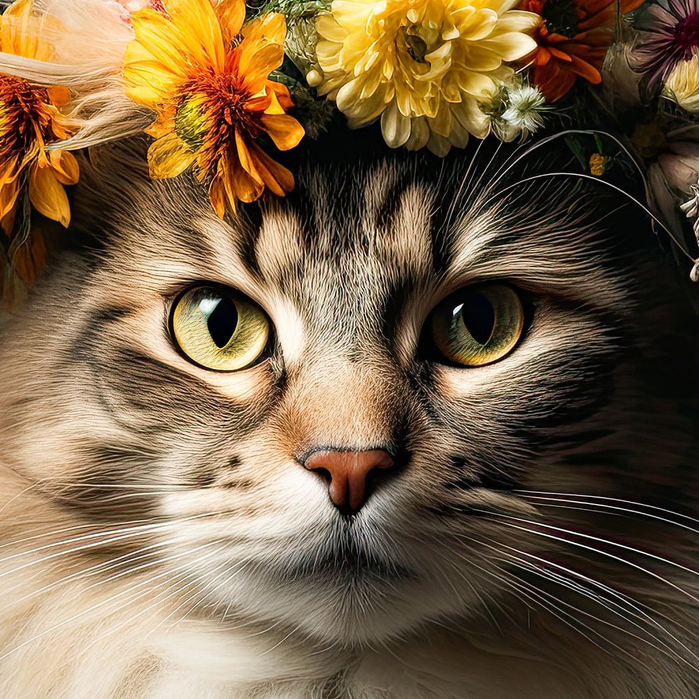 High-quality wall decoration print of a cat with golden yellow-orange floral wreath. This detailed and vibrant print fits well on the wall, both home and office environments. This cat portrait will add a sophisticated and artistic touch to your interiors. Ideal for animal lovers and anyone looking for unique and stylish decoration solutions. Order today and transform your walls with this beautiful image.
