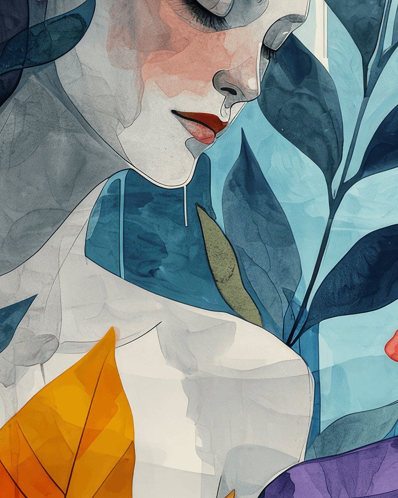 Portrait in warm tones. Illustration in blue, orange, yellow and purple of a young woman in nature. Choose your own size and material with this work and make it a real eye-catcher.