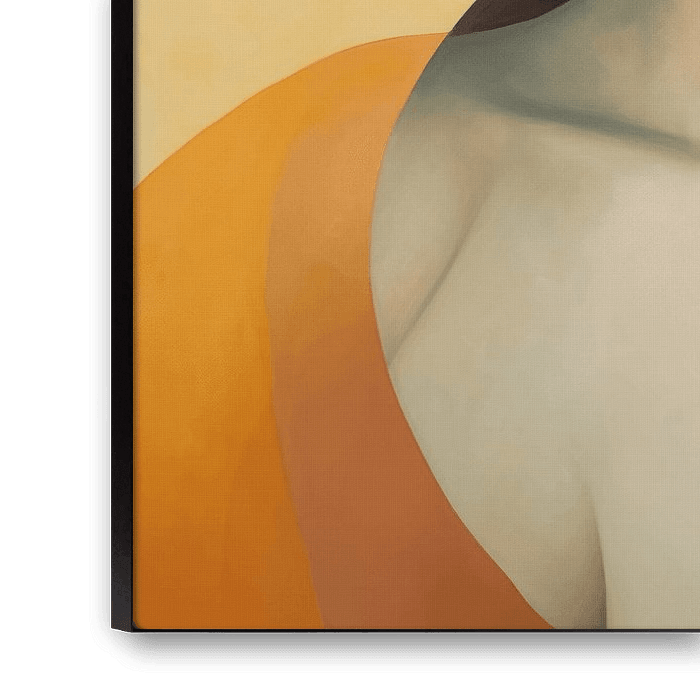 Portrait with a touch of art deco style in blue and orange. Choose the size and material for this eye-catcher yourself and make it fit your interior.