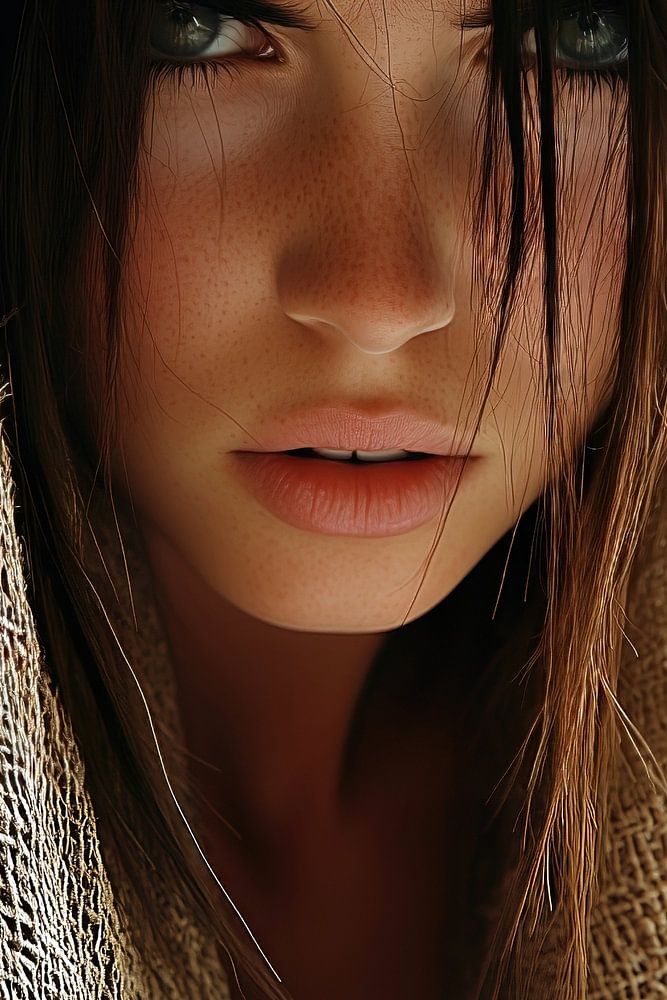 This impressive portrait shows a fascinating interplay of natural beauty and rustic style. At the centre is a brunette model with freckles and an intense, penetrating gaze that seems to penetrate straight into the soul of the viewer. Coarse jute fabric is draped over her head and shoulders, creating an exciting contrast to her fine skin and elegant pose.