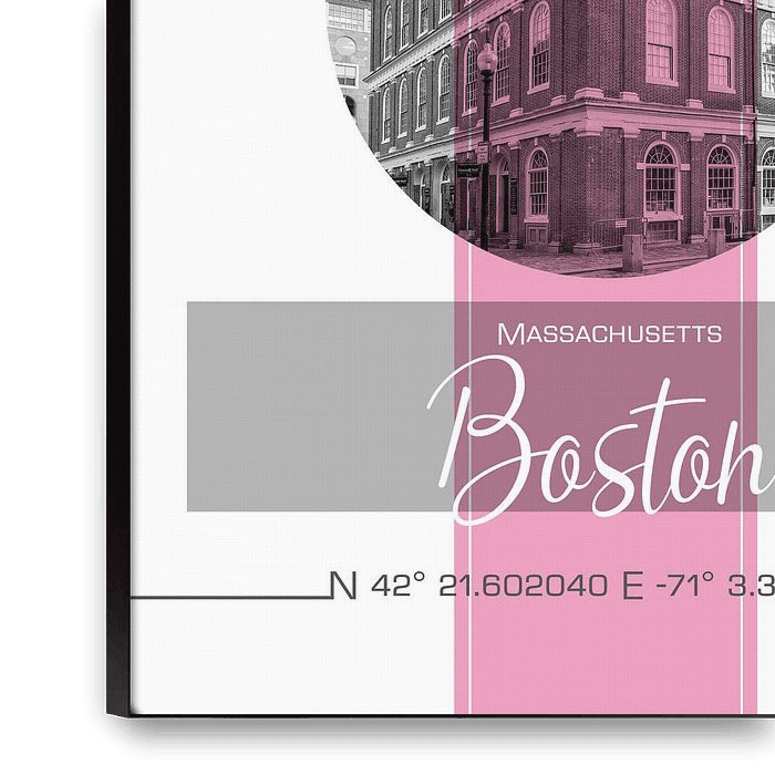 Classic cityscape from Boston in a modern design. Coordinates and other information fuse with the Faneuil Hall creating a minimalist impression.