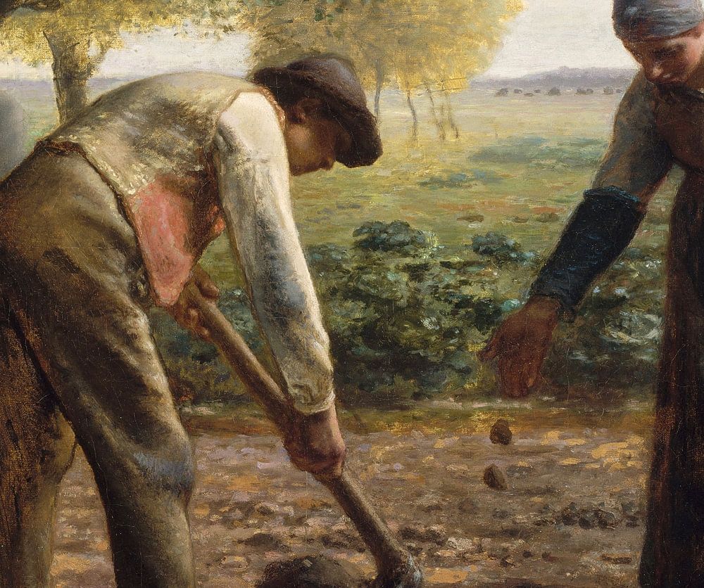 In Millet's time, many people considered potatoes unfit food even for animals, but these peasants are planting potatoes for themselves to eat. "Why should the work of a potato planter," wrote Millet, "be less interesting or less noble than any other activity?" Millet gives the harsh reality of their lives beauty and dignity, placing his solidly modelled, harmonious figures before a hazy landscape just beginning to green in the spring sun. The presence of the donkey and the sleeping child under the tree may recall another poor working family, that of Joseph, Mary, and Jesus.