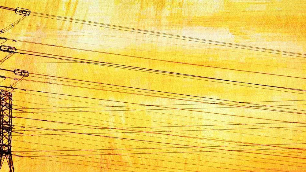 Buy this landscape artwork Power lines and pylons at sunrise mixed media by Werner Lehmann on canvas, ArtFrame, poster and wallpaper, printed on demand in high quality.