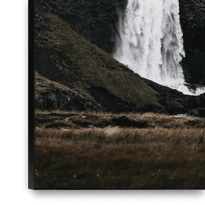 Impressive nature photography of a powerful Icelandic waterfall surrounded by rugged mountains and basalt rocks. The dramatic landscape and the power of the water make this artwork perfect as a wall decoration for lovers of nature, adventure and Scandinavian atmosphere.