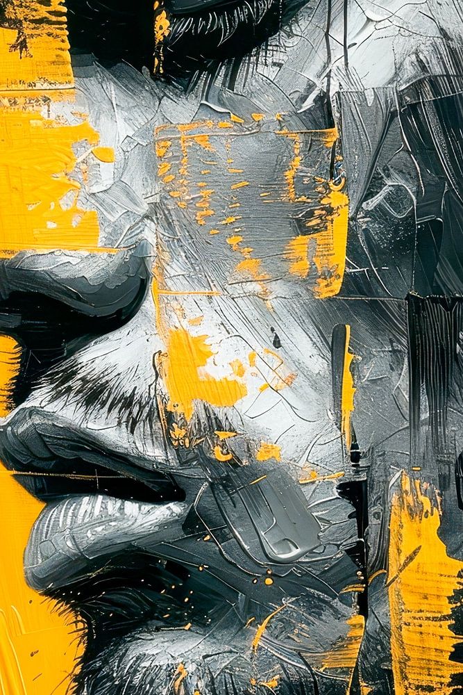 This impressive work of art combines the aesthetics of a modern portrait with the dynamic texture of abstract painting. The gold leaf across the face and background is striking. These golden accents break up the monochrome color palette and give the artwork a luxurious yet modern feel. The textured surface and bold brushstrokes emphasize the depth and vibrancy of the painting, making it a real eye-catcher. Perfect for contemporary interiors to exude elegance and style. The striking faces have been created in collaboration with innovative AI.