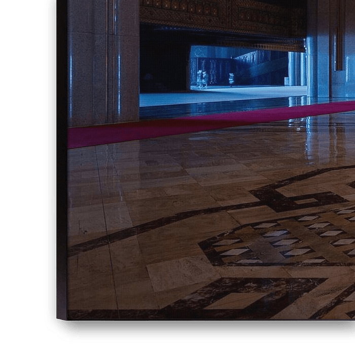 The prayer hall is on the ground floor. The central hall is centrally heated, and provides spectacular underwater views of the Atlantic Ocean. The decorations in the hall are elaborate and exquisite made possible by involving 6000 master artisans of Morocco working on it. It is so large that it can easily accommodate the house of the Notre Dame of Paris or St Peter's of Rome. The wood carvings, the zellij work and the stucco moldings are of elaborate and highly impressive design; the wood used for carving is cedar from the middle Atlas mountains, the marble is from Agadir and granite is brought from Tafraoute.The prayer hall is built to a rectangular plan of 200 meters (660 ft) length and 100 meters (330 ft) width with three naves, which are perpendicular to the qibla wall. The central nave of the hall is 40 meters (130 ft) and larger than the side naves which are 27 meters (89 ft) high. The central hall is undulating with a succession of numerous domes from which glass chandeliers, imported from Murano, are hung. On either side of the hall, there are mezzanine floors with carved dark wood furnishings, which are reserved for women. The doors are electrically operated. A "triptych marble partition with open work and central window flanked by two smaller sized windows" are built on the wall of the façade. Such panels, built with multicolored arches, engraved with ornamented floral designs, appear like a geometrical framework when viewed from the outside. The gates are embellished with marble bars which have faux voussoirs (alternately smooth or sculpted). The pillars of 13 meters (43 ft) height are square in shape with engaged columns and cruciform joining a series of pillars. Geometrically shaped polychromatic zellji with carved plaster are noted with floral and geometric designs with epigraphy. Carved or painted marble or shaped wood are used for these elegant designs, which highlight Islamic art forms.The roof is retractable, illuminating the hall with daytim