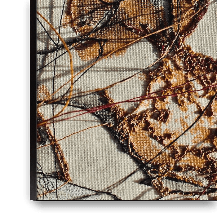 A figurative abstract embroidered work of thread & acrylic on canvas.