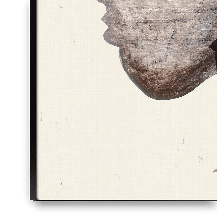 A figurative work of oil paint on panel. An image of an African woman with a lowered gaze. A duel between pride & vulnerable. The structure of the work as well as the fired iron give the overall image a raw effect.