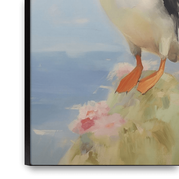 A colourful digital painting of a puffin on a rock. The work gives a dreamy and classic look to your interior!