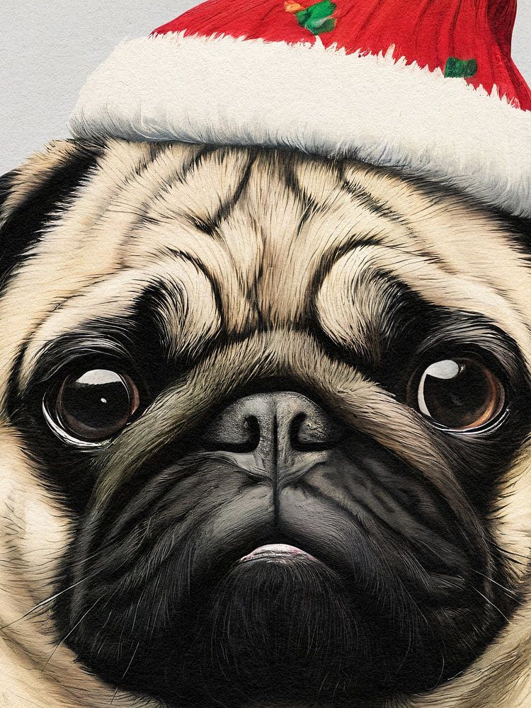 Super sweet A.I. portrait of a pug wearing a red Christmas jumper and a red Santa hat.