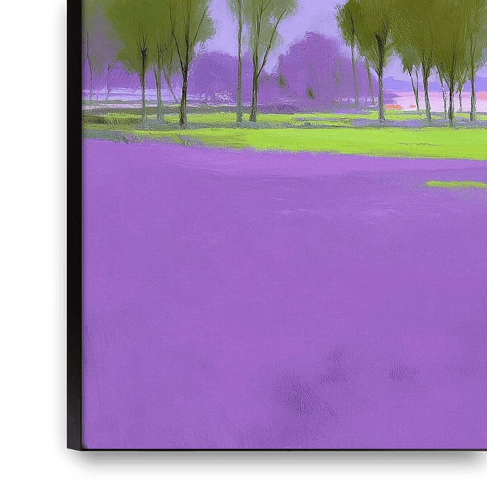 Paars Veld en Ranke Bomen - Dit is een ademende bloemenweide, gevangen tussen twee kleuren die elkaar zacht tegenkomen. Het eerste wat je voelt is de uitgestrektheid van paars onder je voeten — een lavendelvlak dat zich als een zacht tapijt naar de horizon uitstrekt. Daartegenover staat een smalle, bijna elektrische streep groen: een weiland dat feller lijkt omdat het paars ernaast ligt. Het schilderij nodigt uit tot stilte door die simpele tegenstelling: paars en groen, vlak en streep, rust en een kleine, energieke tegenkracht. Het is een bloemenweide schilderij waarin kleur de tekst en vorm de melodie is.