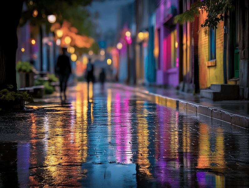 Digital art of a rainy evening street with vibrant neon colours reflecting on the wet road surface, blurred silhouettes of walkers and warm street lamps in a dreamy atmosphere.