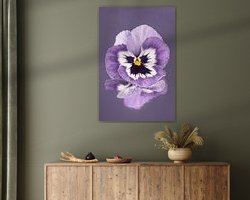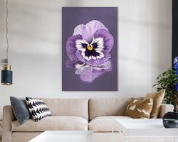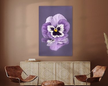 "Purple and white violet on a greyish purple background" is a macro shot of a purple and white violet with a yellow heart. The violet lies on a textured mirrored surface, giving the flower a "picturesque" reflection underneath. If you zoom in on the work you can see this beautifully!