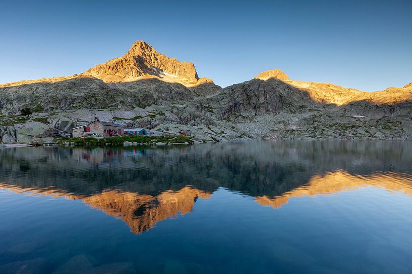 The Pyrenees at sunset, France: a mountain landscape with Pic Palas reflected in the mountain lake in front of the d'Arremoulit mountain hut. A cloudless evening with a stunning reflection of this mountain in the French section of the mountain range on the border with Spain.