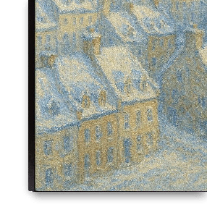 Under a pale northern sun, Quebec City lies draped in snow — rooftops softened to velvet white, the air glowing with crystalline calm. The artist captures this moment of stillness with the same fascination Monet brought to his snowy landscapes of Vétheuil and Argenteuil.