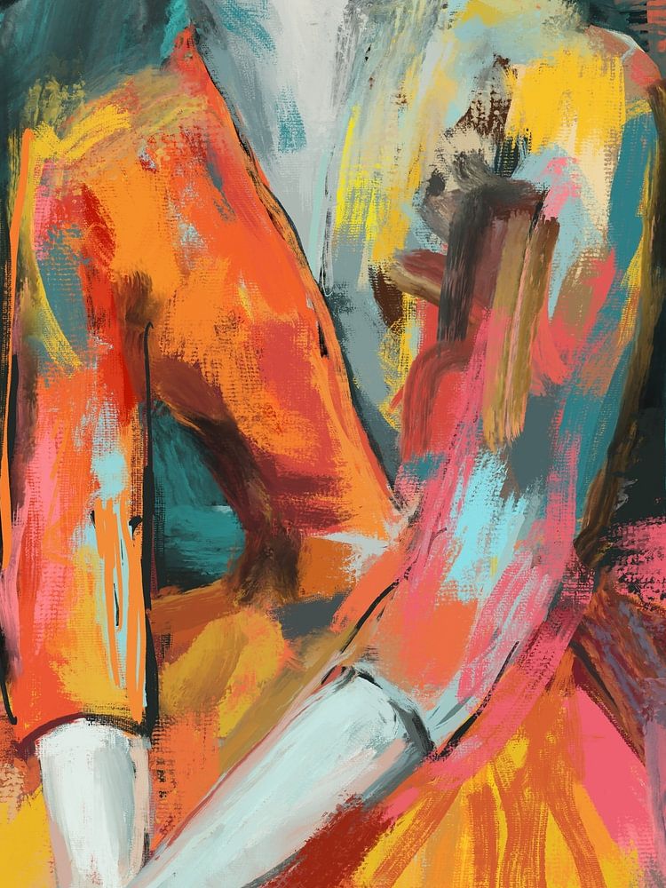 An expressive portrait of a contemplative woman in a vivid orange and crimson dress, set against a deep teal abstract background. Bold brushstrokes and contrasting colors create a striking balance between warmth and introspective calm