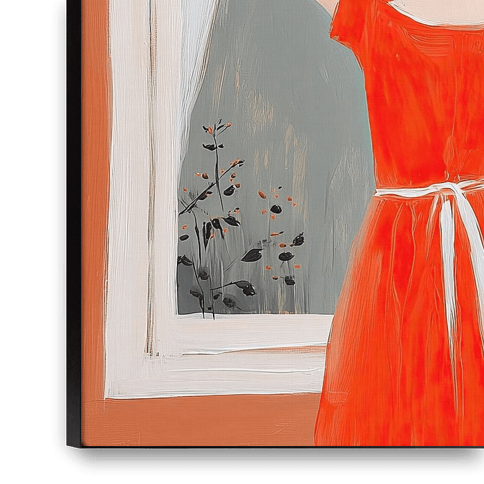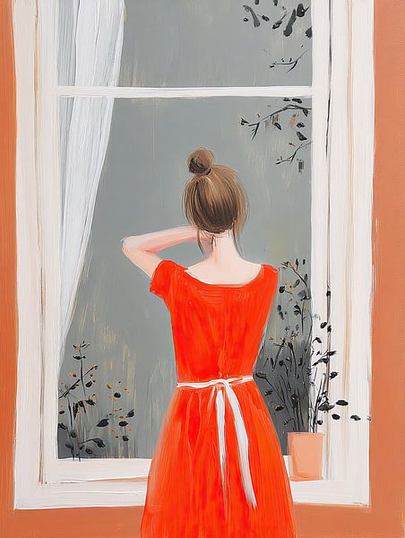 This artwork portrays a quiet, introspective moment featuring a woman standing by a window, viewed from behind, dressed in a flowing red dress tied softly at the waist. The composition focuses on stillness and contemplation, inviting the viewer into a private scene of reflection. The gentle posture and subtle gesture of her hand near…
