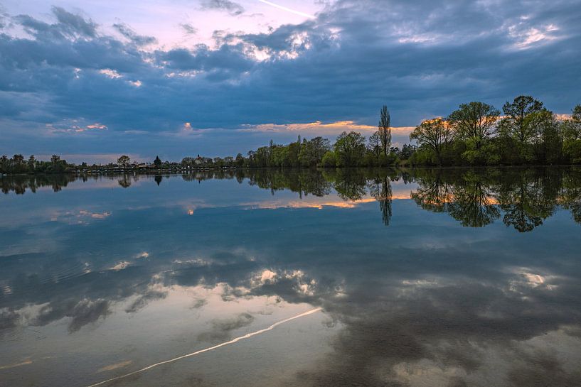 The gentle twilight bathes Laupheim’s quarry lake in a deep blue, whilst the dense cloud formations and the silhouettes of the trees are reflected almost perfectly on the mirror-smooth surface of the water. A subtle golden streak of light on the horizon breaks up the cool colour palette and lends the scene a meditative calm, emphasised…