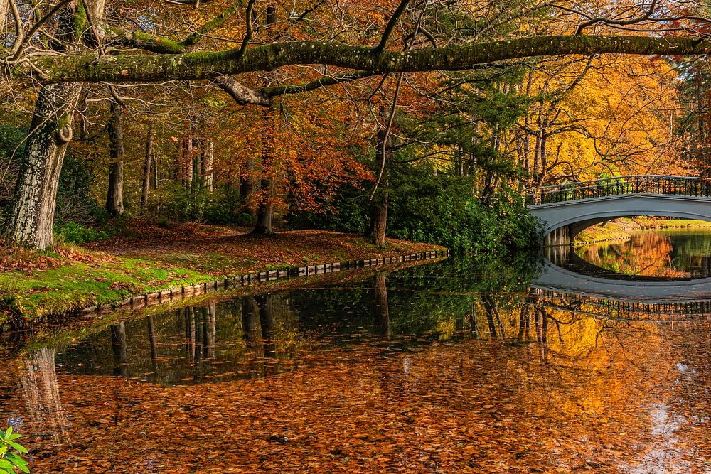 ✅ Unique composition - vibrant autumn colours, mirrored reflections and a picturesque bridge.