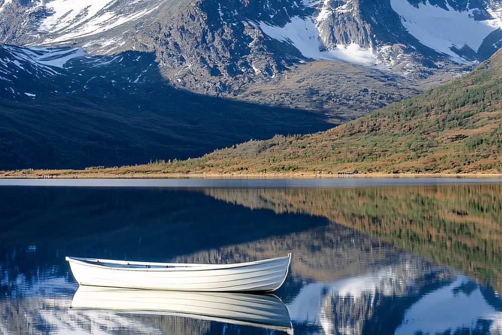 This beautiful image captures the serenity of a lonely boat floating on a calm mountain lake. The water perfectly reflects the surrounding mountains, whose snow-capped peaks create an impressive landscape. This peaceful scene exudes peace and balance and takes the viewer to a world far away from the hustle and bustle of everyday life. Ideal as a wall decoration to create a relaxing atmosphere in the home or office, and a wonderful addition for lovers of nature and landscape photography.