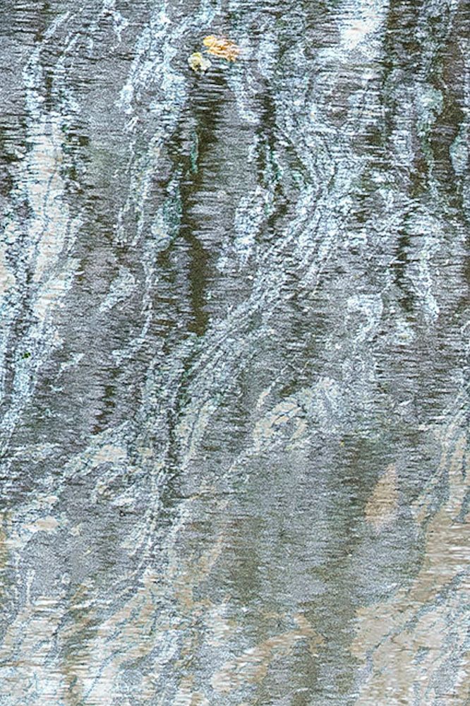 The vertical, undulating lines create a rhythmic pattern reminiscent of marble, tree bark or even molten metal. The soft blue-grey tones evoke a sense of calm, whilst the subtle warm accents (the small orange/brown spots) add just enough contrast to keep the eye engaged. The distortion caused by the water creates an organic, almost…
