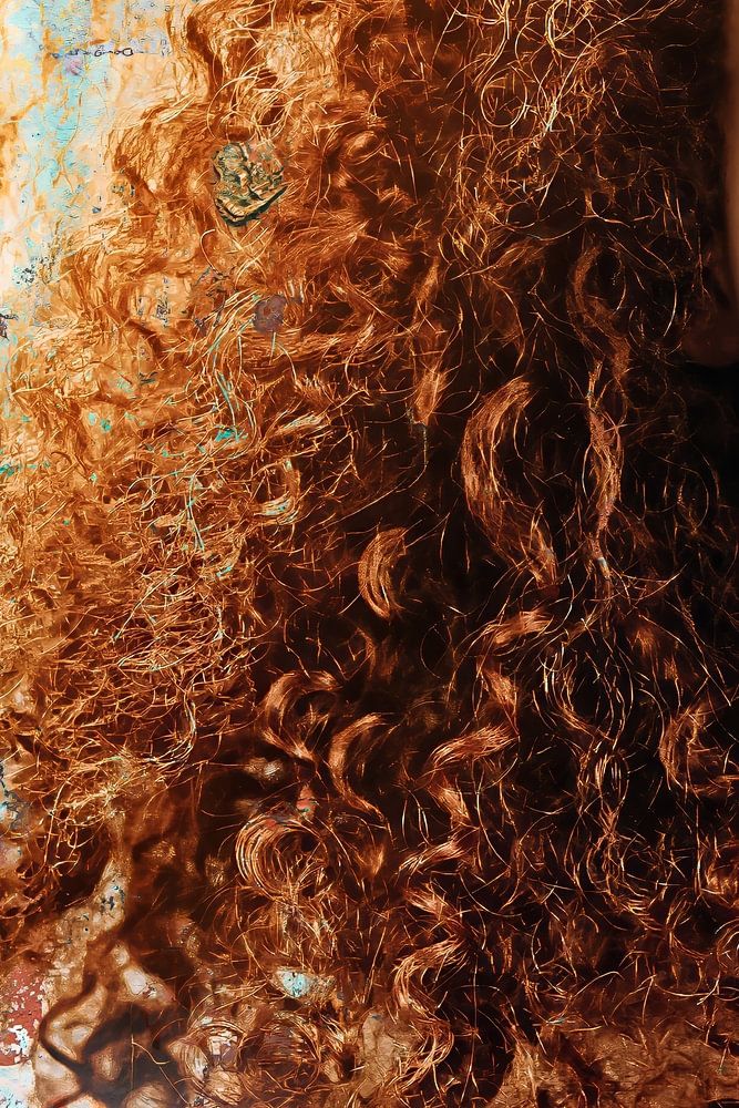 RED is a mixed art portrait of a girl and a flaking red and blue wall. This girl's beautiful red curls blend into the wall and the wall continues into her face. You can almost feel the paint chips through this work.