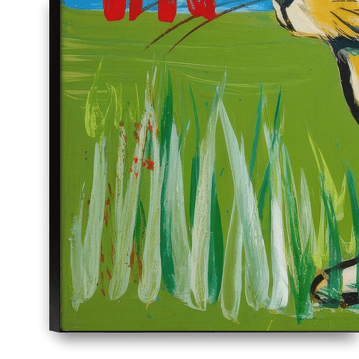 A cheerful yellow rabbit sits alert among tall green blades of grass, with a bright blue sky and soft white clouds above. On the side, a red building suggests a rural setting. Expressive brushstrokes and playful splashes of paint convey energy and movement. The animal looks to the right, ears pricked, while the contours remain rough and…