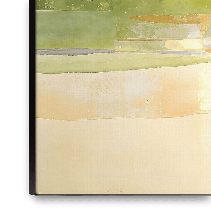 “Radiant Interval” is a horizontal abstract artwork that captures the expansive, luminous energy of spring light. Broad, softly overlapping shapes stretch across the canvas, creating a calm yet dynamic composition. The base palette of warm cream, ivory, and soft blush establishes a serene backdrop, while layered accents of matcha green,…